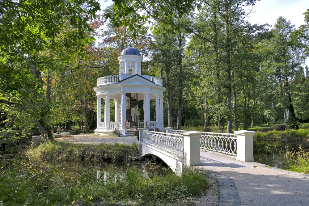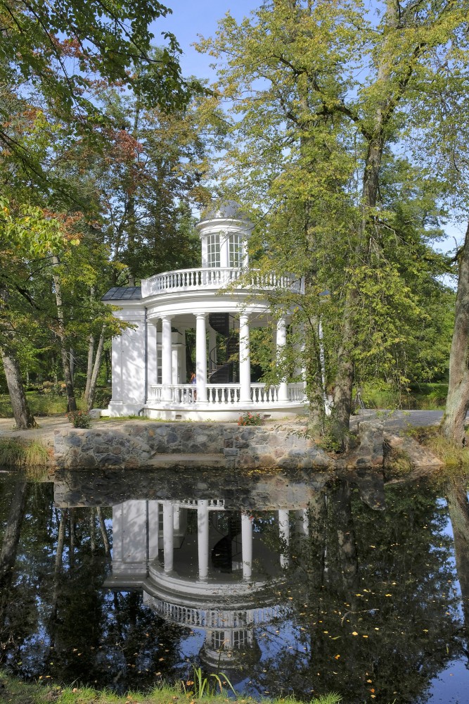 Kafijas paviljons Ķemeru parkā. Paviljons – rotonda ir viens no Ķemeru parka arhitektūras izteiksmīgākajiem objektiem un atrodas uz mākslīgi izveidotās „Mīlestības saliņas” Vēršupītes krastā. Jau kopš 19.gs. beigām te atradās kokgriezumiem bagātīgi rotāts paviljons, kas nopostīts I Pasaules kara laikā. Tagadējā mūra rotonda uzcelta 1928. gadā pēc arhitekta Fridriha Skujiņa projekta. Te atradās kafijas paviljons, kur kūrorta viesiem piedāvāja bezalkoholiskos dzērienus, tēju un kafiju ar uzkodām. Izklaidei bija uzstādīts radio. Tepat bija iespējams izīrēt laiviņas, lai vizinātos pa Vēršupīti un kanālu sistēmu. Padomju laikā pie „Mīlestības saliņas” notika Bērnības svētki.