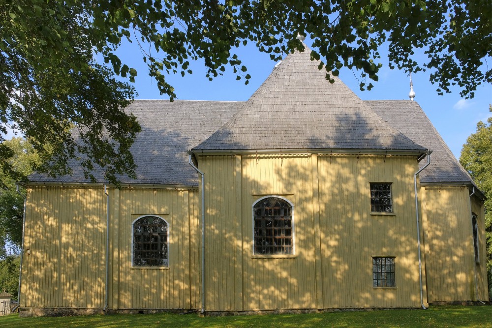 Ēkas āriene ir salīdzinoši atturīga un raksturīga tradicionālai koka baznīcai, tomēr tā veidota krusta plānā un ar augstu jumtu, kuru rotā nelieli tornīši ar krustiem. Šis pieticīgais eksterjers rada vēl lielāku pārsteigumu, ieejot iekšā: interjers tiek raksturots kā bagātīgi veidots, ar baroka kompozīcijas lielo altāri un četriem sānu altāriem, kuros izmantotas kolonnas, kokgriezumi un gleznas, dažviet papildinātas ar sudrabotu apdari.